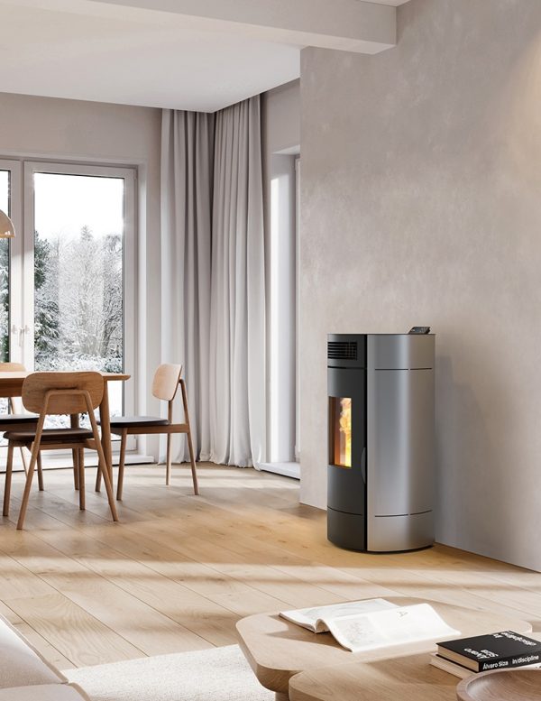 Pellet stove equipped with WiFi as standard to control the device remotely from a smartphone or tablet and via a dedicated application.