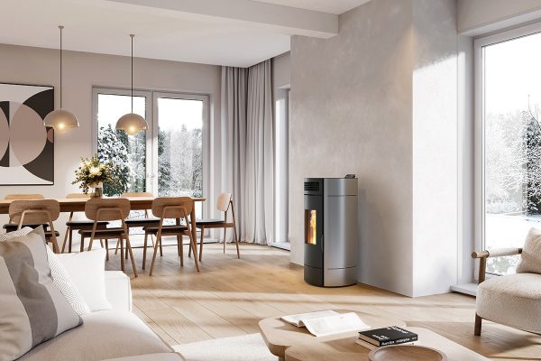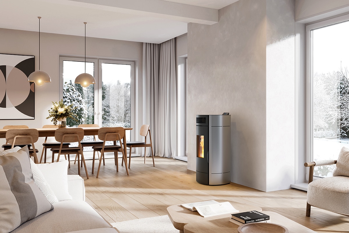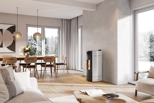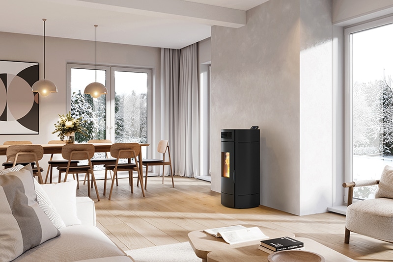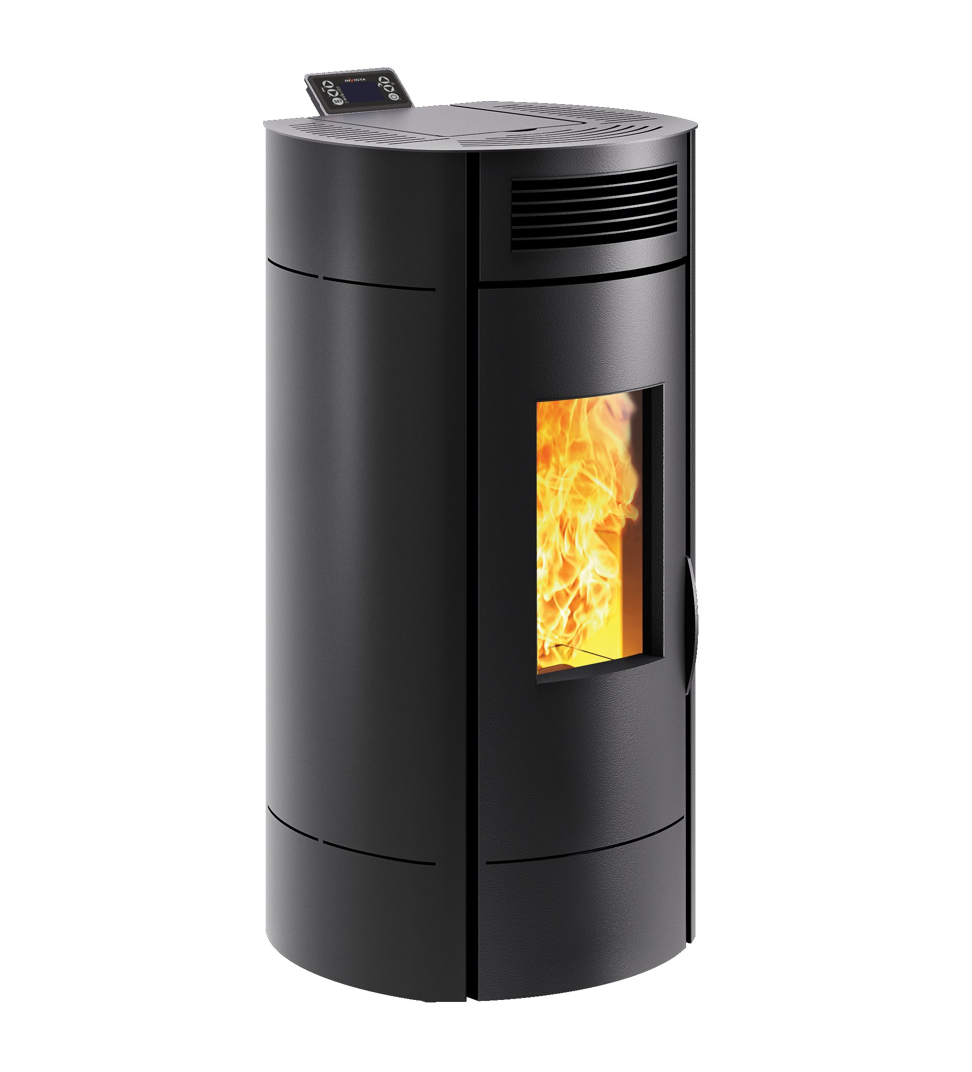 Pellet stove equipped with WiFi as standard to control the device remotely from a smartphone or tablet and via a dedicated application.